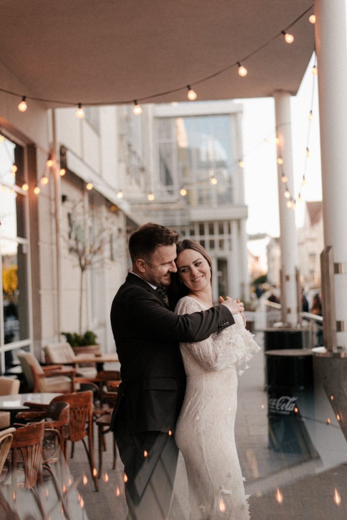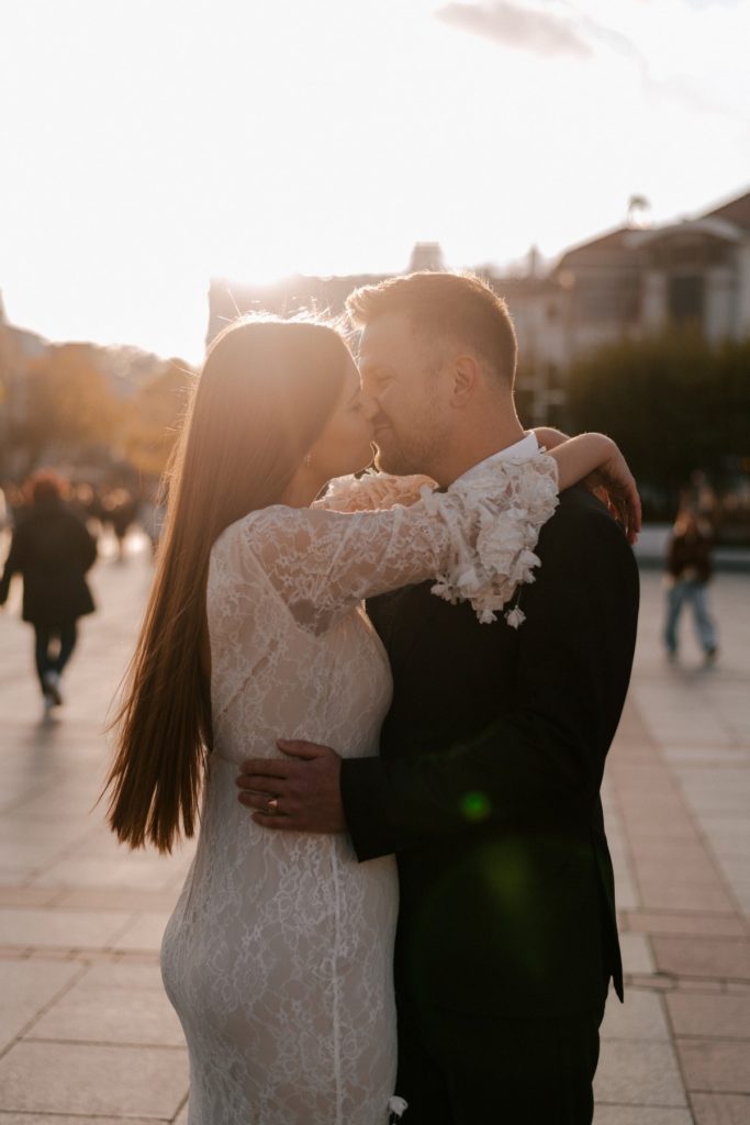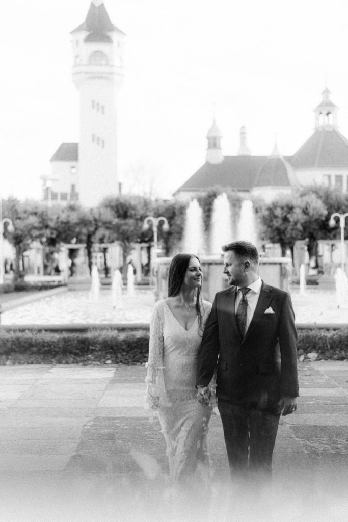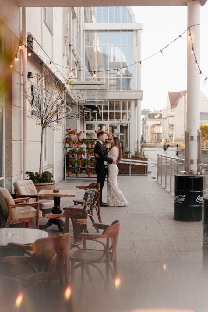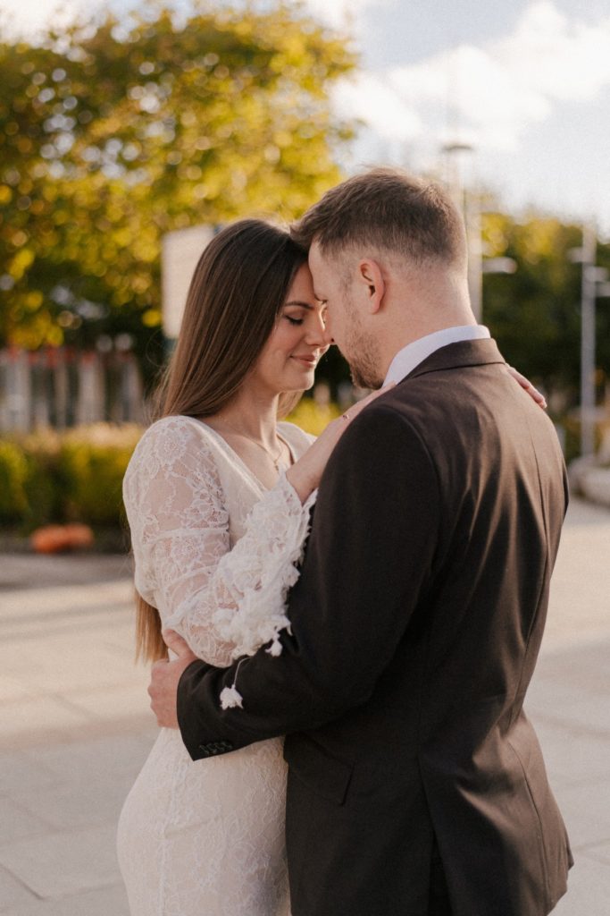 Najpierw poszliśmy w miejskie kadry w samym sercu Sopotu – okolice Molo, zachodzące słońce przebijające się między budynkami, odrobina codzienności, która tworzy piękne tło dla fotografii par. Popularne miejsca na fotospacery są świetne. Spontanicznie można znaleźć dużo ciekawych kadrów a przechodzi ciekawie wtapiają się w tło. Lubię taką codzienność na zdjęciach. Na pewno po latach zyska ona na wartości.